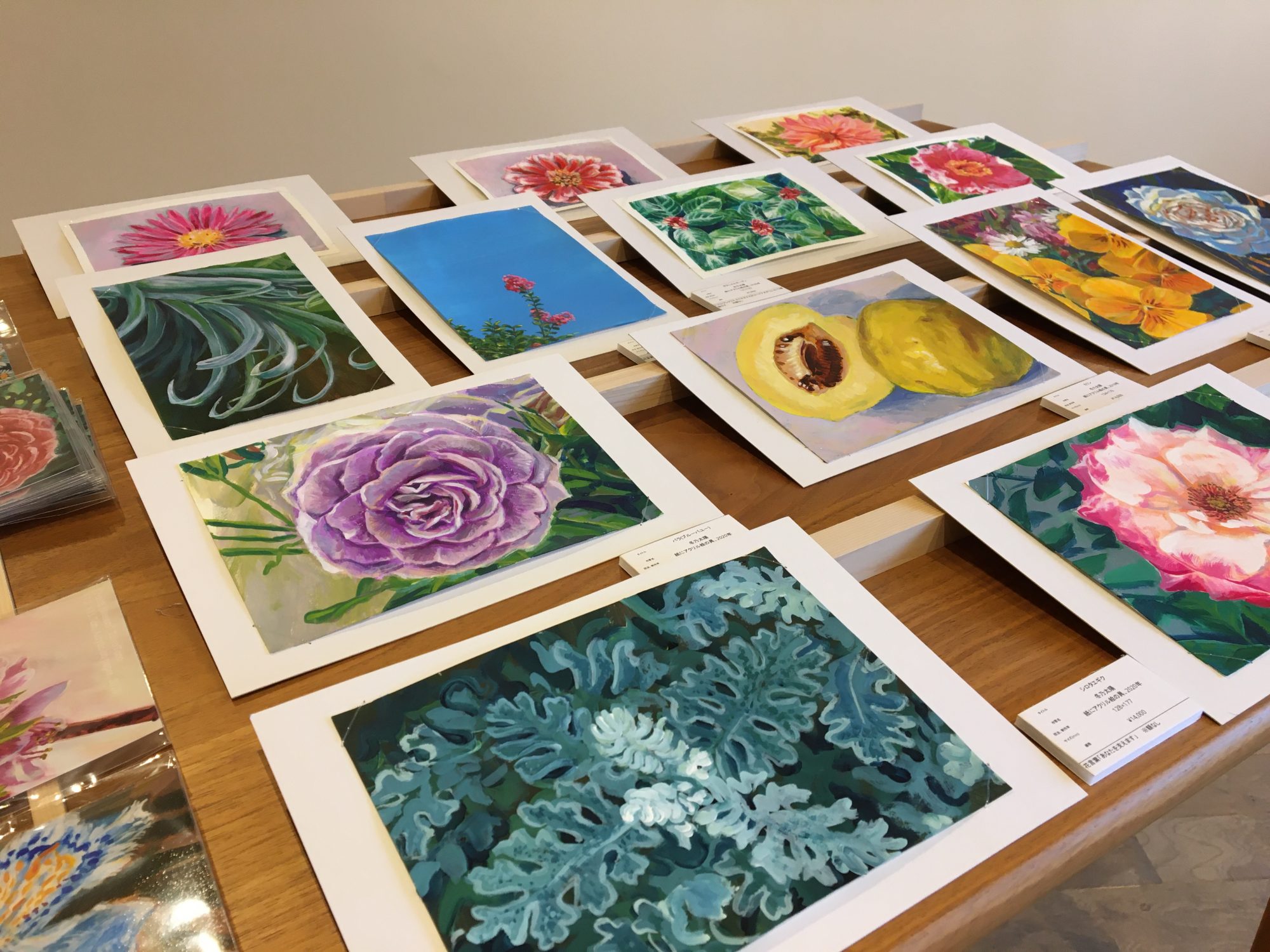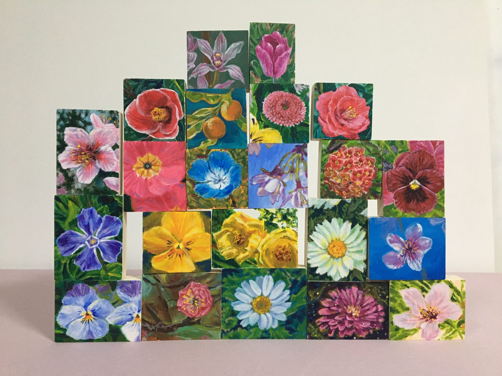 4月にプレゼント企画を行いました!「積める絵画 花つみき」という小さな作品を22作描いたのですが、それを全部どどーんとプレゼントする企画でした。コロナの中で、何か幸せをお届けしたいと思って企画しました。これも22個全部プレゼントさせてもらったのですが、誰もいらないって言われたらどうしよう。と開催する前は怖かったです。だって経験上、0円でも絵は売れないと知っているからです。。